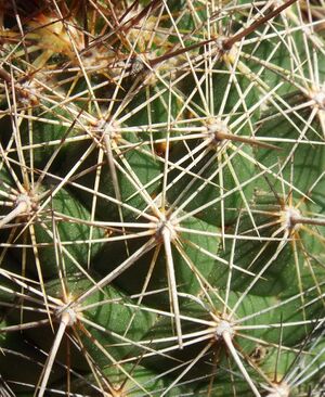 - Peremtövis: 16–20 db, kétharmaduk oldalra vagy lefelé áll, sugaras elrendezésű, kissé elálló, egyenes, tűszerű, a szomszédos areolák töviseivel átfedik egymást. Hosszuk 11–15 mm. Színük áttetsző sárgás vagy fehér, a felsők csúcsa sötét.