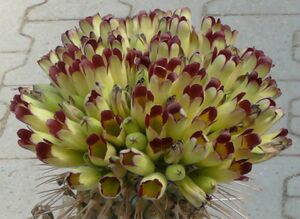 A szemölcsökből vastag, tűszerű, sárgásszürke tövisek erednek. A tövisek enyhén, a felső részen nagyobb szögben lefelé hajlanak. A növény felső részén sűrűbben és hosszabb (5–7 cm-es) tövisek fejlődnek, míg az alsó részen rövidebbek és ritkábbak.