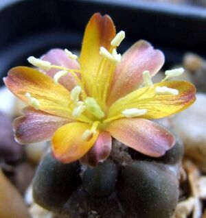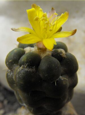 Kistermetű, 3–5 cm átmérőjű és magasságú, egyhajtású növény, amely szinte teljesen az alapkőzetbe mélyed. Neoténiás, majdnem geofiton jellegű. Alakja többnyire lapított gömb vagy gömb, kultúrában – főként oltva – kissé megnyúlhat. Színe olajzöldtől barnásig változik, de előfordulnak sötét, majdnem feketéslila, enyhén szürkés bőrszövetű egyedek is. Gyökere erős, akár 10 cm hosszú karógyökér.
